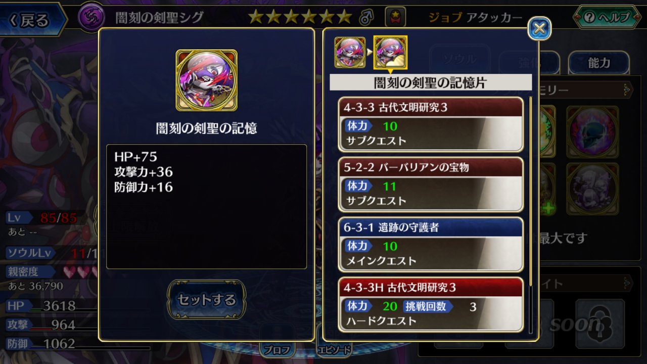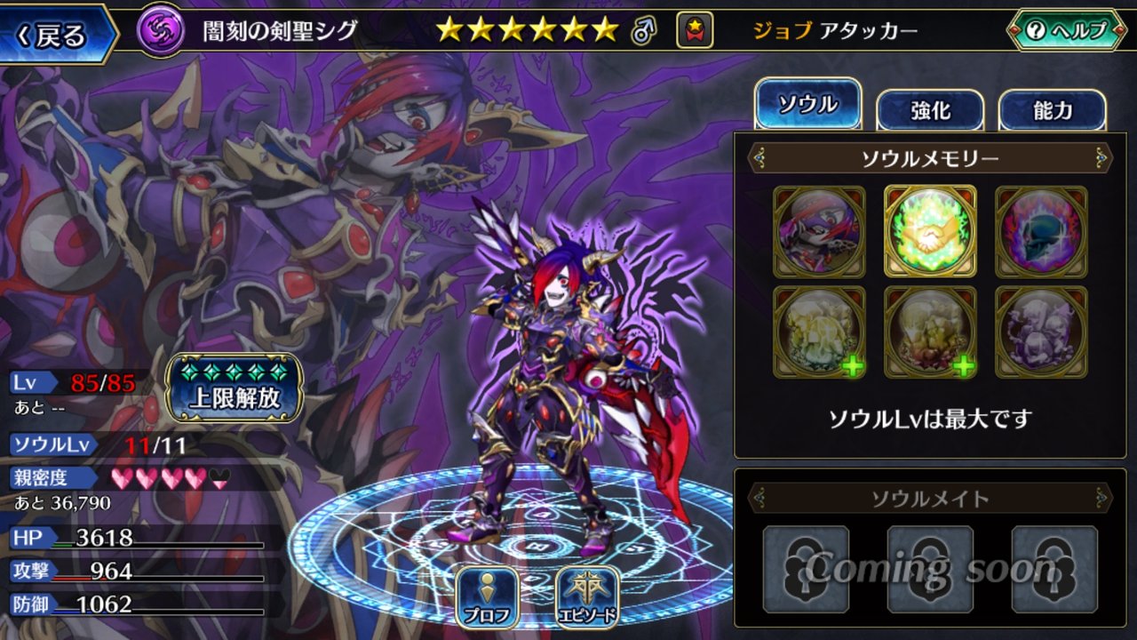 ソウルメモリー6枠の左上、シグの顔が描かれている素材をタップすると・・