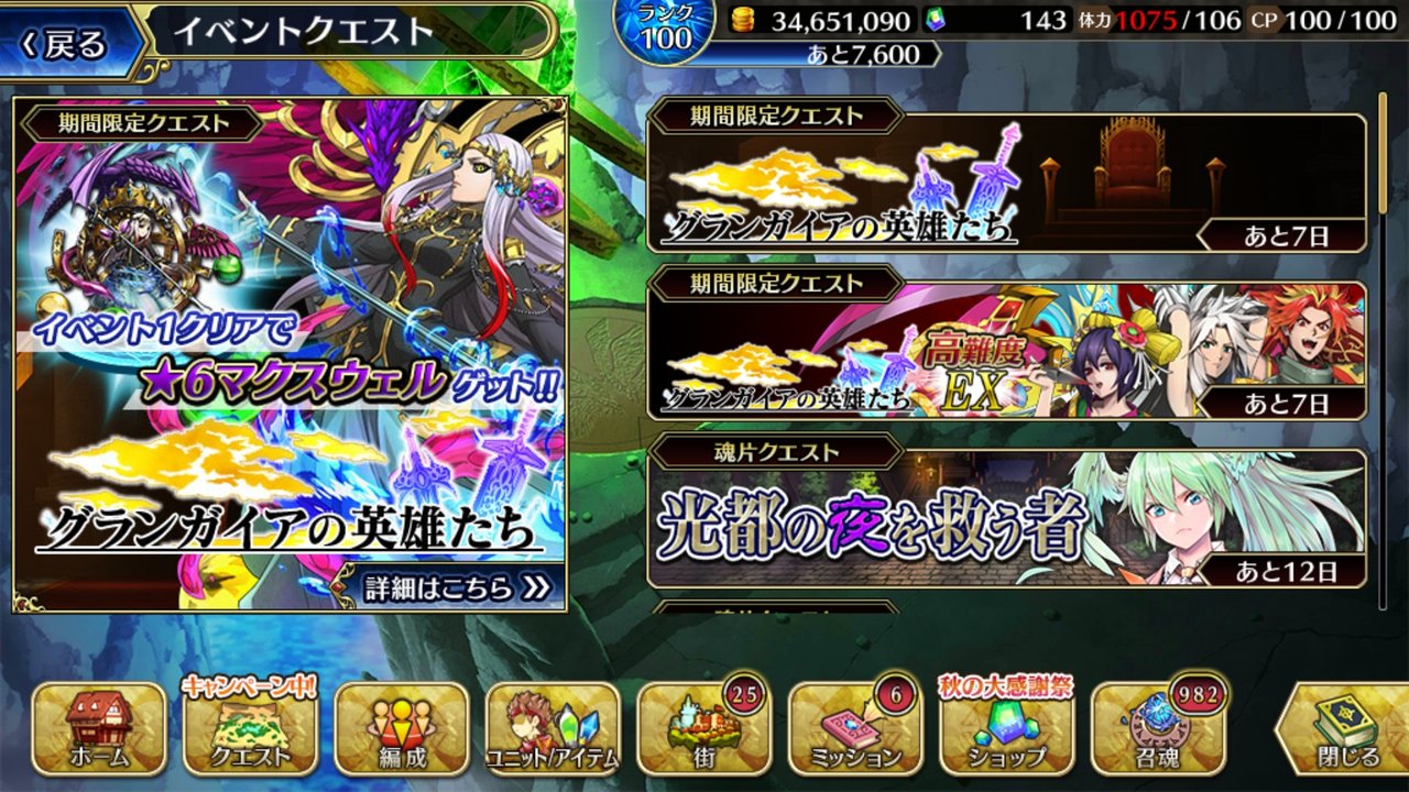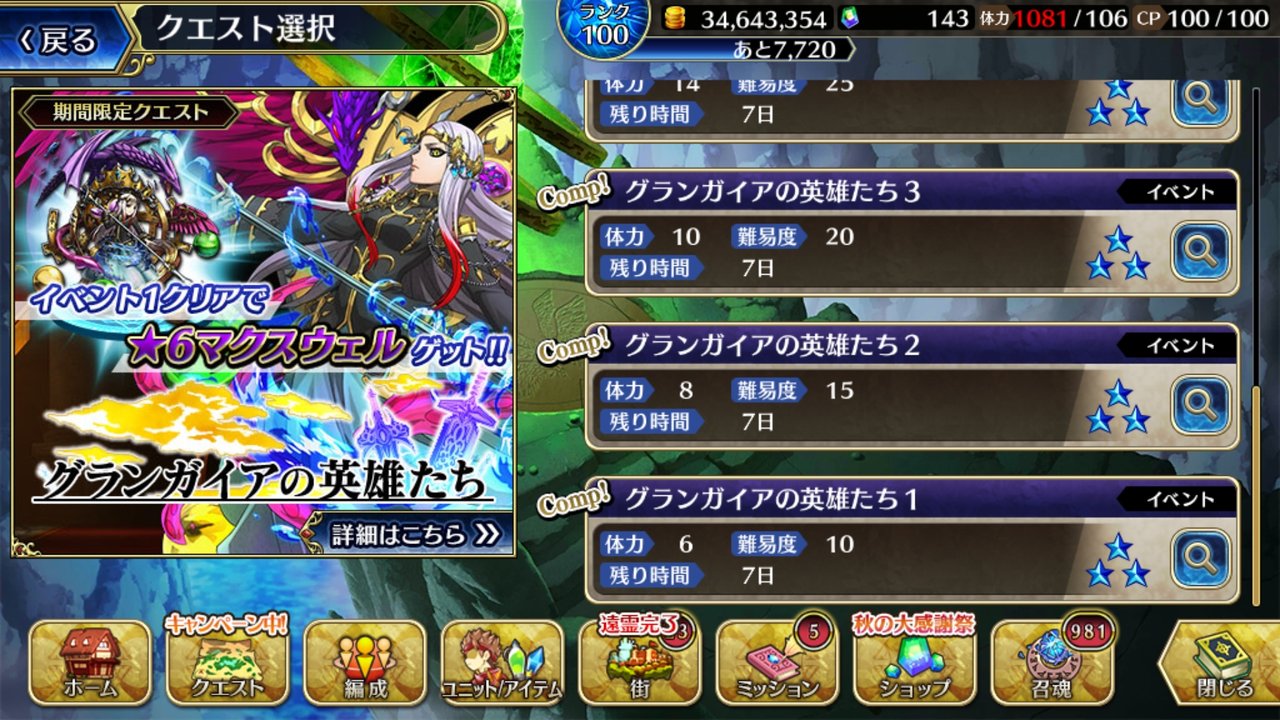 まずはクエストからグランガイアの英雄たちを選択して